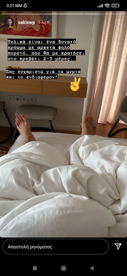 «Τελικά είναι ένα δυνατό κρύωμα με αρκετά ψηλό πυρετό, που θα με κρατήσει στο κρεβάτι 2-3 μέρες. Σας ευχαριστώ για τα μηνύματα και το ενδιαφέρον», έγραψε ο Σάκης.