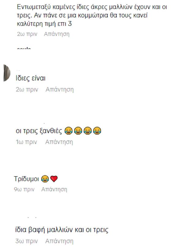 Το βίντεο έγινε viral στην πλατφόρμα από τις πρώτες ώρες και όχι μόνο για την καλή σχέση που έχουν οι πρώην μεταξύ τους. Πολλοί είναι εκείνοι που δεν μπόρεσαν να αφήσουν ασχολίαστη, τη μεγάλη ομοιότητα που παρουσιάζουν τα μαλλιά και των τριών. Και ο Νίκος Καρβέλας και η Αννίτα Πάνια, όπως και η Άννα Βίσση έχουν ξανθιά και ανοιχτόχρωμα μαλλιά στο ίδιο σχεδόν μήκος και είναι σχεδόν ίδια για πολλούς από εκείνους που παρακολούθησαν το βίντεο. «Οι τρίδυμες», «Ίδια βαφή μαλλιών και οι τρεις» έγραψαν, μεταξύ άλλων.