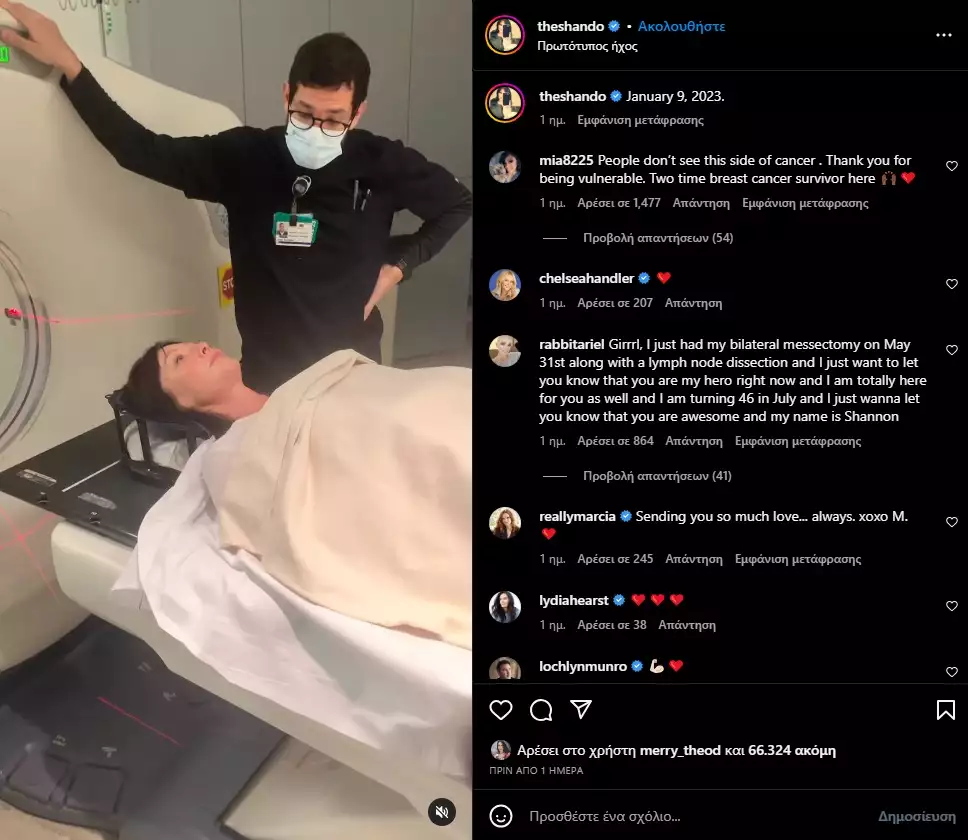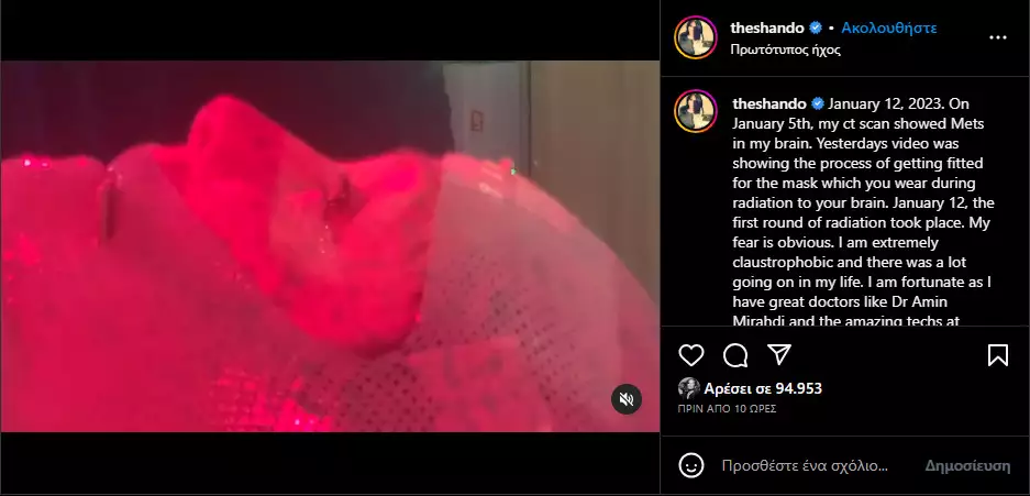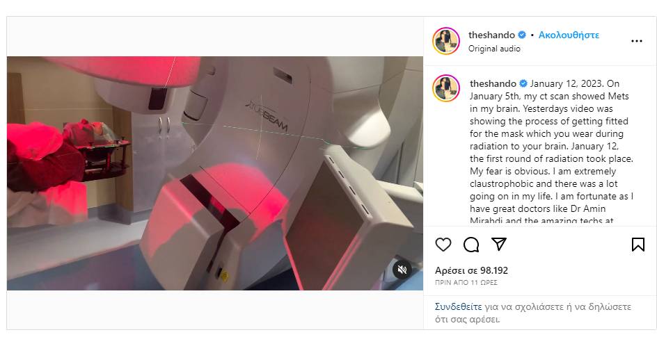 «Στις 12 Ιανουαρίου πραγματοποιήθηκε ο πρώτος κύκλος ακτινοβολίας. Ο φόβος μου είναι προφανής. Είμαι εξαιρετικά κλειστοφοβική ενώ έχουν συμβεί πολλά στη ζωή μου. Είμαι τυχερή καθώς έχω σπουδαίους γιατρούς. Αλλά αυτός ο φόβος…η αναταραχή… η χρονική στιγμή όλων αυτών… Έτσι μπορεί να μοιάζει ο καρκίνος» έγραψε.