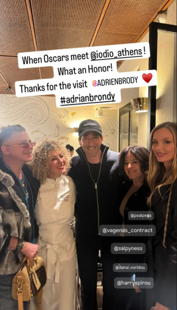 Μάλιστα, χθες το βράδυ, ο Άντριεν Μπρόντι απόλαυσε ένα γεύμα με θαλασσινά σε διάσημο εστιατόριο του Κολωνακίου, μαζί με τη σύζυγό του και τη βραβευμένη με αστέρι Michelin σεφ, Γεωργιάννα Χιλιαδάκη. Μάλιστα, η σεφ φωτογραφήθηκε μαζί με τον ηθοποιό και την Τζορτζίνα Τσάπμαν, με τις εικόνες να δημοσιεύονται στο Instagram.