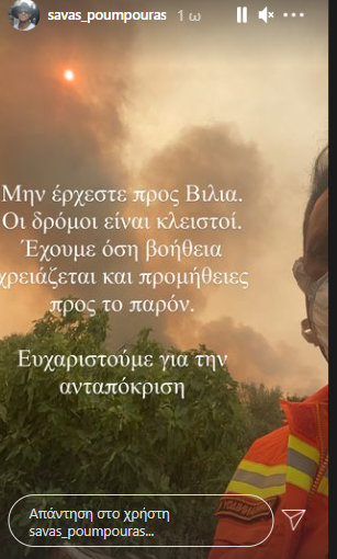 «Μην έρχεστε προς Βίλια. Οι δρόμοι είναι κλειστοί. Έχουμε όση βοήθεια χρειάζεται και προμήθειες προς το παρόν. Ευχαριστούμε για την ανταπόκριση», έγραψε.
