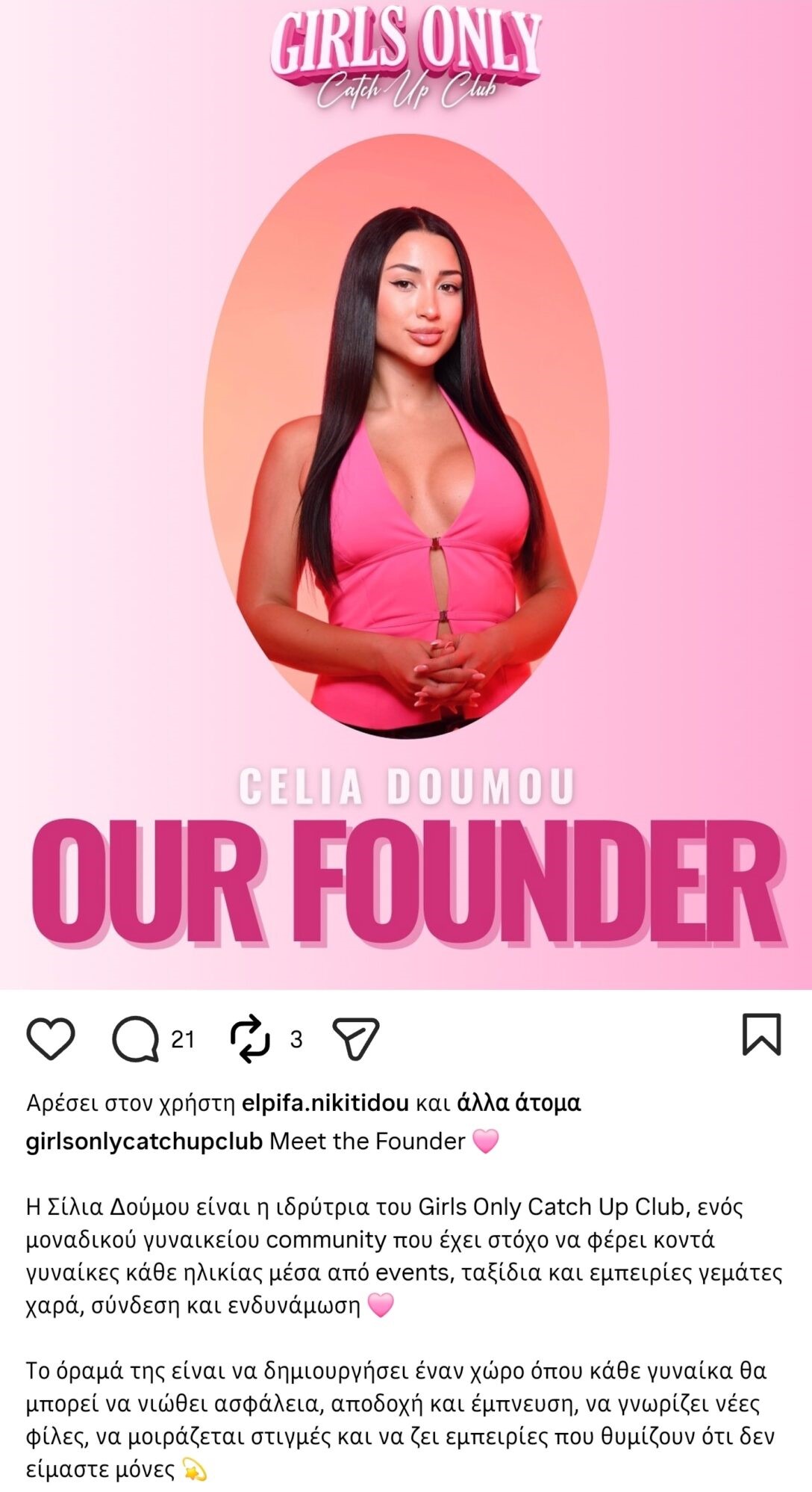 Για τη Σίλια Δούμου το «Girls Only Catch Up Club» δεν αποτελεί απλώς ένα club, αλλά μια κοινότητα, μια γυναικεία παρέα που απαρτίζεται από πρόσωπα κάθε ηλικίας, με στόχο τη δημιουργία ενός ασφαλούς και υποστηρικτικού χώρου, όπου κάθε γυναίκα θα μπορεί να αισθάνεται αποδοχή και έμπνευση, να γνωρίζει νέες φίλες, να μοιράζεται στιγμές και να ζει εμπειρίες που υπενθυμίζουν ότι καμία δεν είναι μόνη.