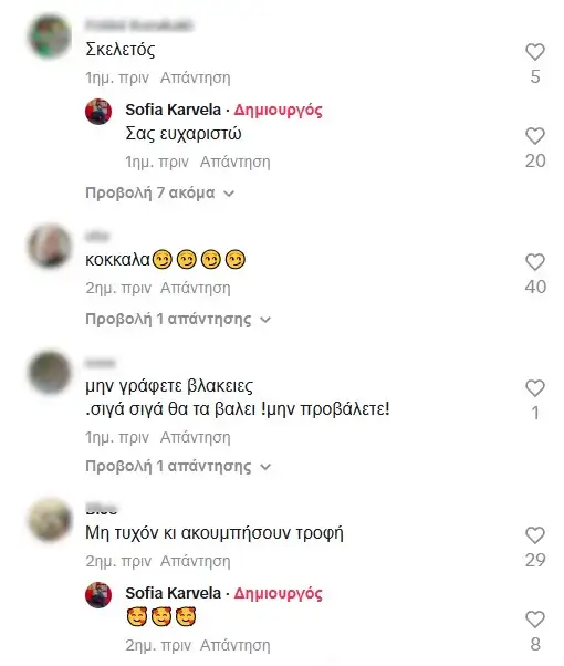 Η Σοφία Καρβέλα με σχόλιό της κάτω από τη δημοσίευση στο Tik Tok γράφει: «Δεν είμαι άρρωστη, έτσι επιλέγω να είμαι και το δέχομαι, ευχαριστώ»