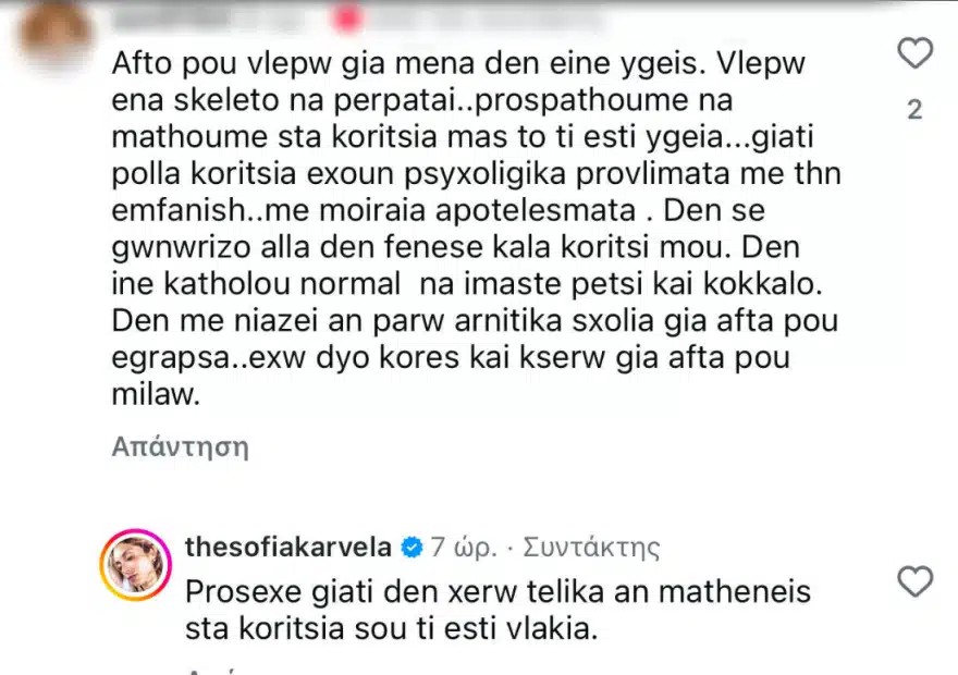 Σε άλλη περίπτωση αντέδρασε με έντονο ύφος σε σχόλιο που αμφισβητούσε την υγεία της και μεταξύ άλλων ανέφερε «βλέπω έναν σκελετό να περπατά» και «δεν είναι καθόλου νορμάλ να είμαστε πετσί και κόκκαλο».