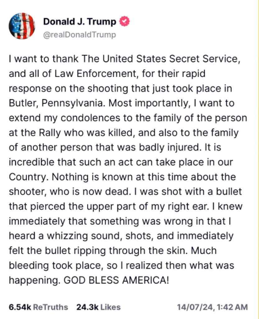 Στην ανάρτησή του στον ιστότοπο κοινωνικής δικτύωσης Truth Social, εξέφρασε τις ευχαριστίες του στη Μυστική Υπηρεσία και τις αρχές επιβολής του νόμου για την «ταχεία ανταπόκρισή τους».