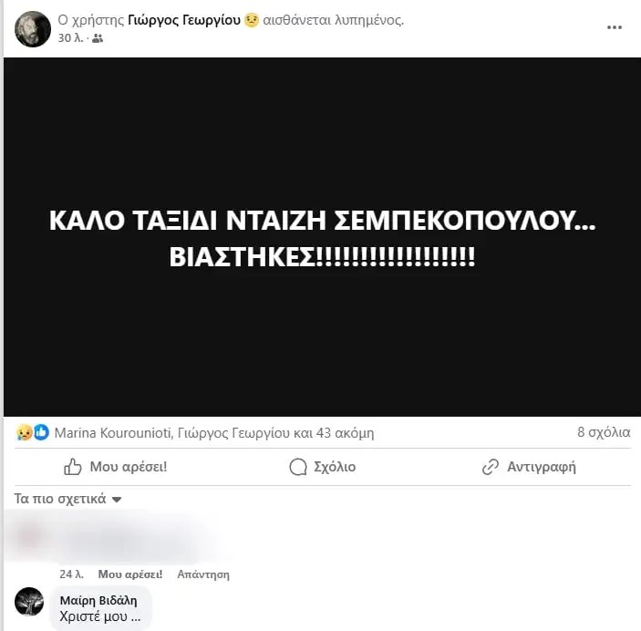 Πιο συγκεκριμένα, μία ανάρτηση του συναδέλφου της, Γιώργου Γεωργίου αιφνιδίασε τον καλλιτεχνικό χώρο. «Καλό ταξίδι Νταίζη Σεμπεκοπούλου! Βιάστηκες» έγραψε ο ηθοποιός και η Μαίρη Βιδάλη έσπευσε να σχολιάσει.