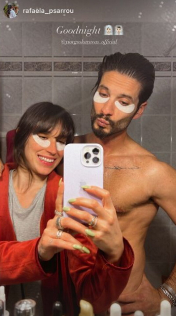 Στον προσωπικό της λογαριασμό στο Instagram, η Ραφαέλα Ψαρρού ανέβασε φωτογραφία όπου ποζάρουν στο μπάνιο του σπιτιού τους και έχουν βάλει eye patches προκειμένου να διατηρηθεί το βλέμμα τους φρέσκο και να εξαλείψουν οποιοδήποτε πρήξιμο κάτω από τα μάτια.