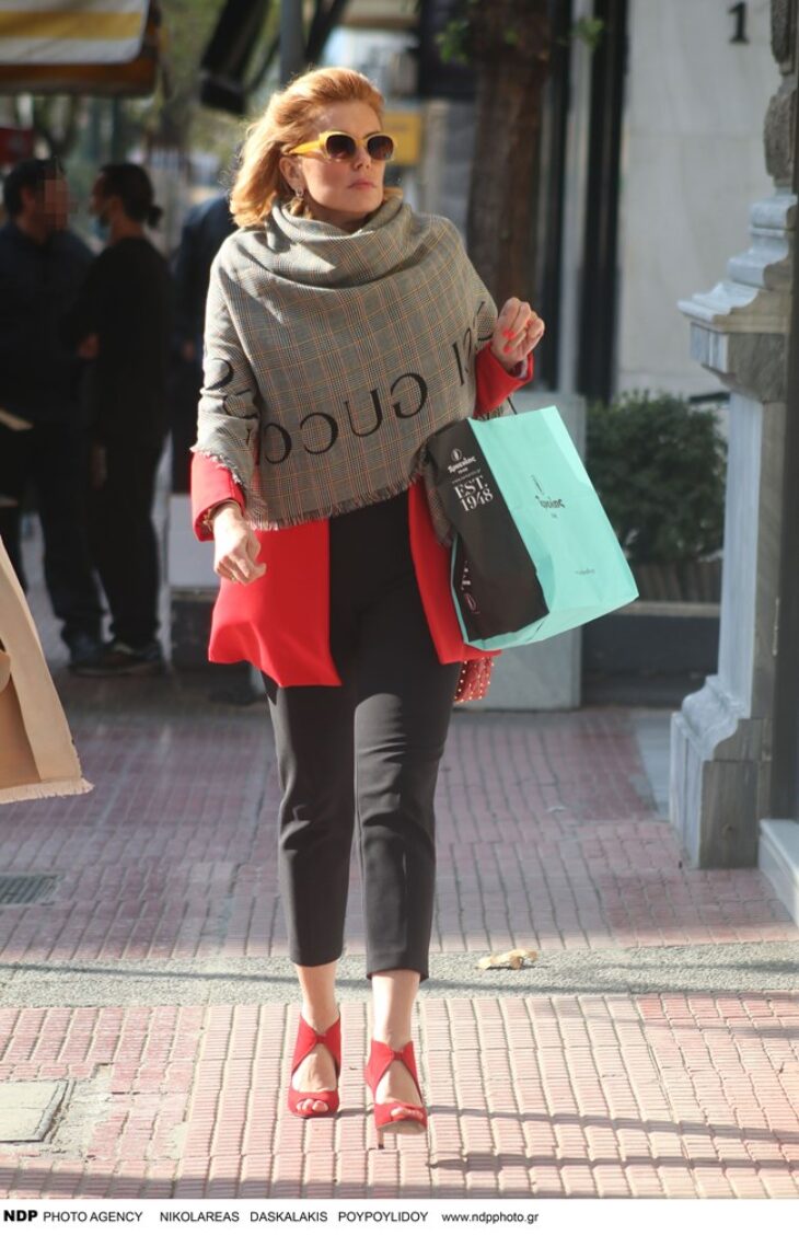 Αν και λίγο υπερβολική για μια πρωινή εμφάνιση, η Μανωλίδου δεν είχε πρόβλημα να περπατήσει πάνω στα ψηλοτάκουνα βραδινά παπούτσια της στους δρόμους της Αθήνας.