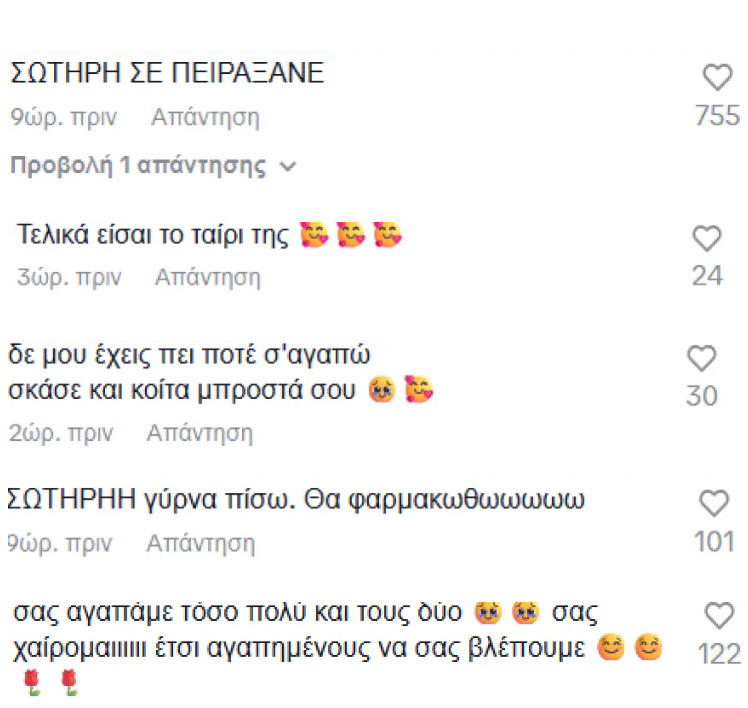 Κάτω από την ανάρτηση αρκετοί εμφανίστηκαν ενθουσιασμένοι με τη συνάντηση των δύο ηθοποιών με πολλούς να εκφράζουν τη χαρά τους μέσα από σχόλια που έκαναν. «Σας αγαπάμε τόσο πολύ και τους δύο, σας χαίρομαι, έτσι αγαπημένους να σας βλέπουμε» σημείωσε κάποιος και κάποιος άλλος πρόσθεσε: «Τελικά είσαι το ταίρι της». Από την ανάρτηση του ηθοποιού δεν έλειψαν και σχόλια με ατάκες της «Στέλλας», όπως «Σωτήρη σε πείραξε» και «Σωτήρη γύρνα πίσω θα φαρμακωθώ».