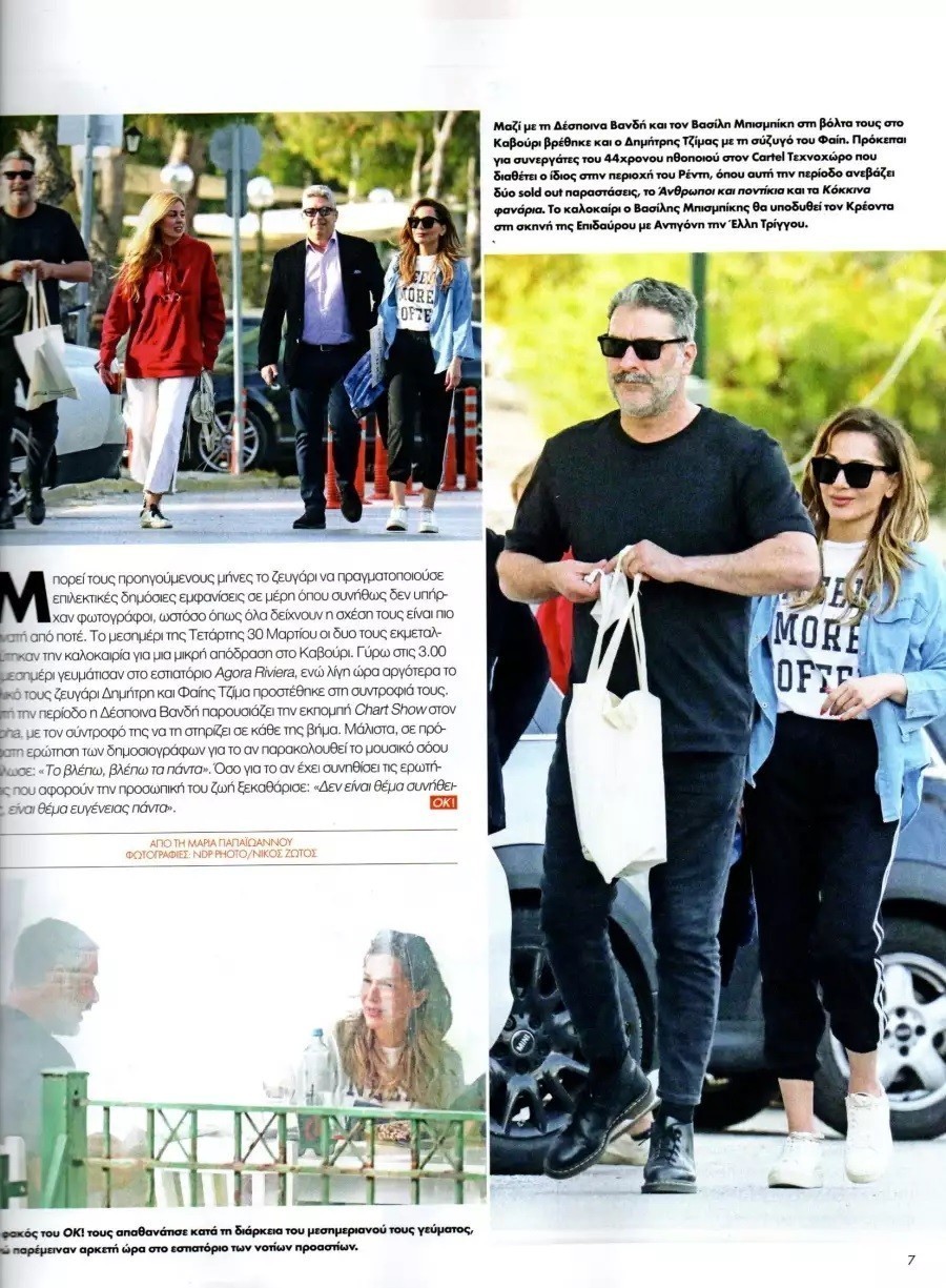Περίπου στις 3 το μεσημέρι, η Δέσποινα Βανδή και ο Βασίλης Μπισμπίκης γευμάτισαν στο εστιατόριο Agora Riviera, ενώ λίγη ώρα αργότερα το φιλικό τους ζευγάρι Δημήτρη και Φαίης Τζίμα προστέθηκε στη συντροφιά τους.