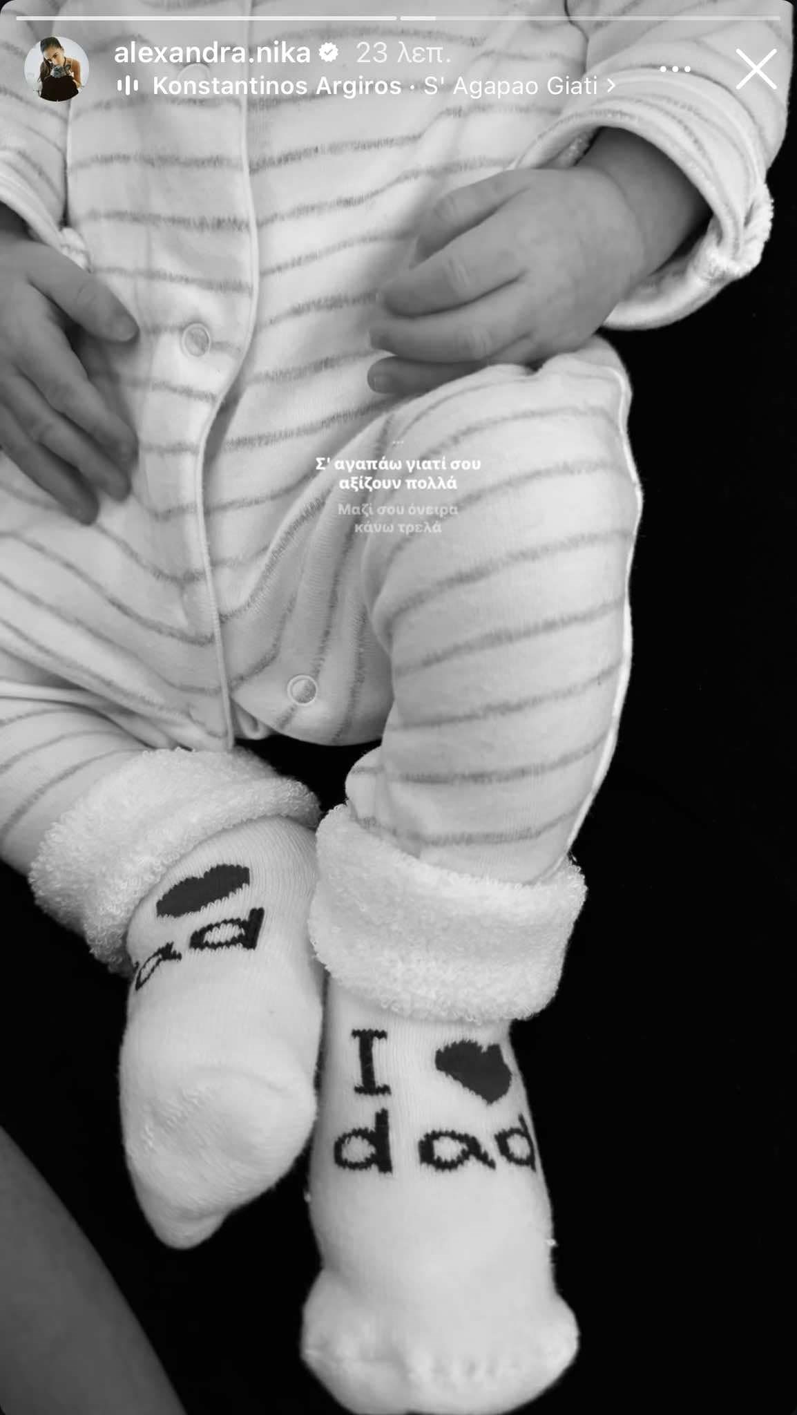 Μετά τη φωτογραφία αυτή, η Αλεξάνδρα Νίκα δημοσίευσε ακόμη μια φωτογραφία του γιου της στην οποία πρόσθεσε το τραγούδι του Κωνσταντίνου Αργυρού, «Σ’ αγαπάω γιατί» ενώ όπως θα δεις, οι κάλτσες του μικρού Βασίλη γράφουν, «Ι love dad».