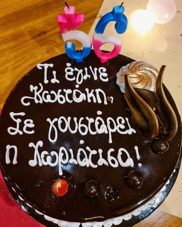 Μας έδειξε και την εντυπωσιακή τούρτα γενεθλίων, στην οποία έγραφε την διάσημη ατάκα της Τζένης Μπότση στο “Σημάδι του Έρωτα”, «Τι έγινε Κωστάκη, σε γουστάρει η Χωριάτισσα!». Ο Στράτος λοιπόν έγινε 56 ετών και είναι πιο ευτυχισμένος από ποτέ, ενώ πάντα βρίσκεται στο πλευρό του η σύζυγός του, Σοφία Μαριόλα, την οποία λατρεύει.