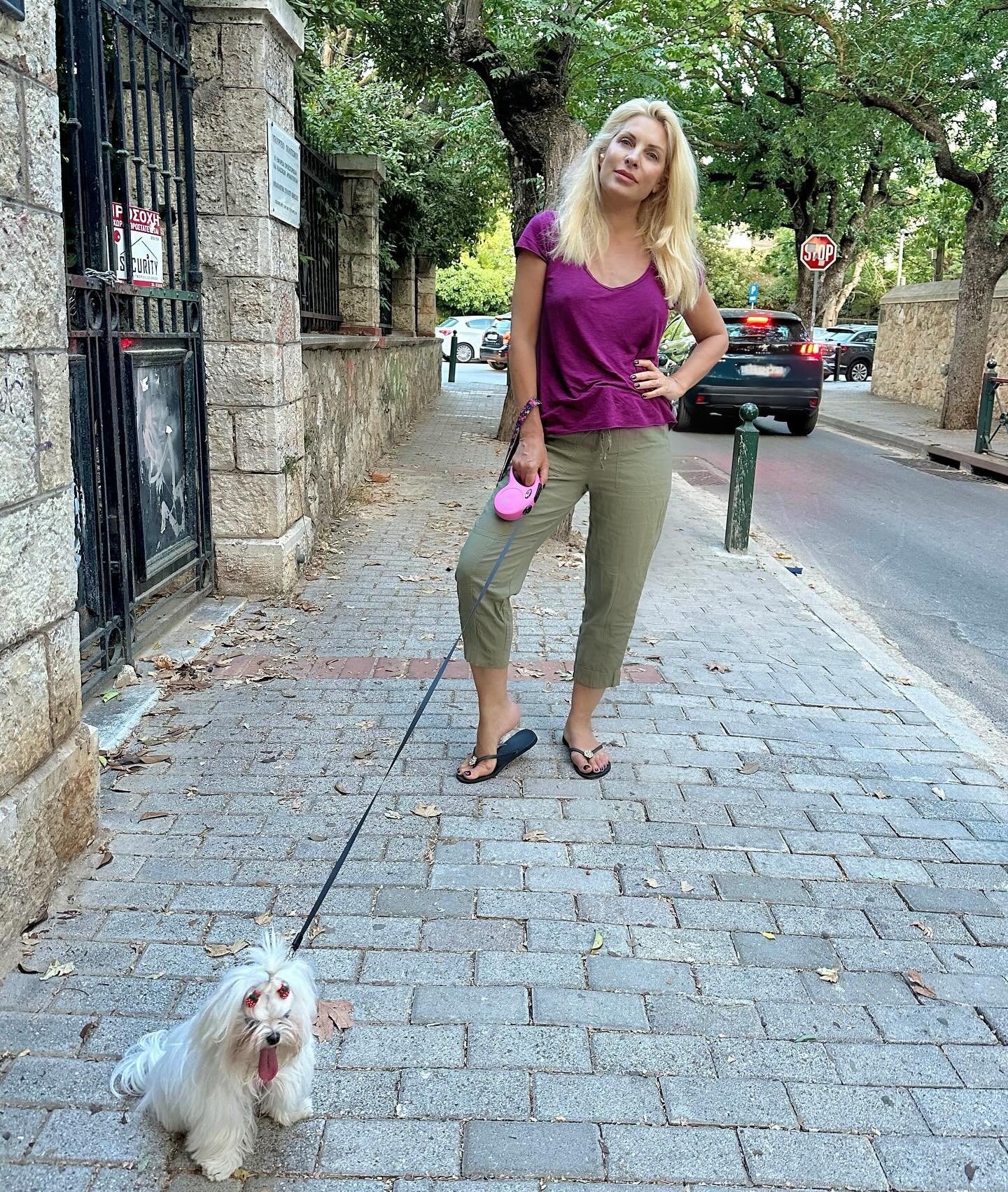 Η Μενεγάκη προκάλεσε… μποντιλιάρισμα στην Κηφισιά: Έβγαλε βόλτα τον σκύλο, άβαφη με παντόφλα κι όλοι κορνάραν