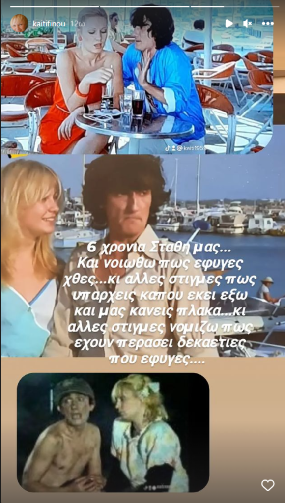 Στη συνέχεια, ανάρτησε ακόμα μια φωτογραφία, στην οποία συνδύασε κάποιες κοινές σκηνές τους από παλιές ελληνικές ταινίες. Πάνω σε αυτή έγραψε: «6 χρόνια Στάθη μας. Και νιώθω πως έφυγες χθες. Κι άλλες στιγμές πως υπάρχεις κάπου εκεί έξω και μας κάνεις πλάκα. Κι άλλες στιγμές, νομίζω πως έχουν περάσει δεκαετίες που έφυγες».