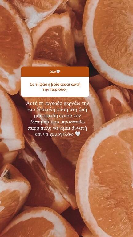 Εκείνη απάντησε χαρακτηριστικά: «Αυτή την περίοδο περνάω την πιο δύσκολη φάση στη ζωή μου επειδή έχασα τον μπαμπά μου. Προσπαθώ πάρα πολύ να είμαι δυνατή και να χαμογελάω».