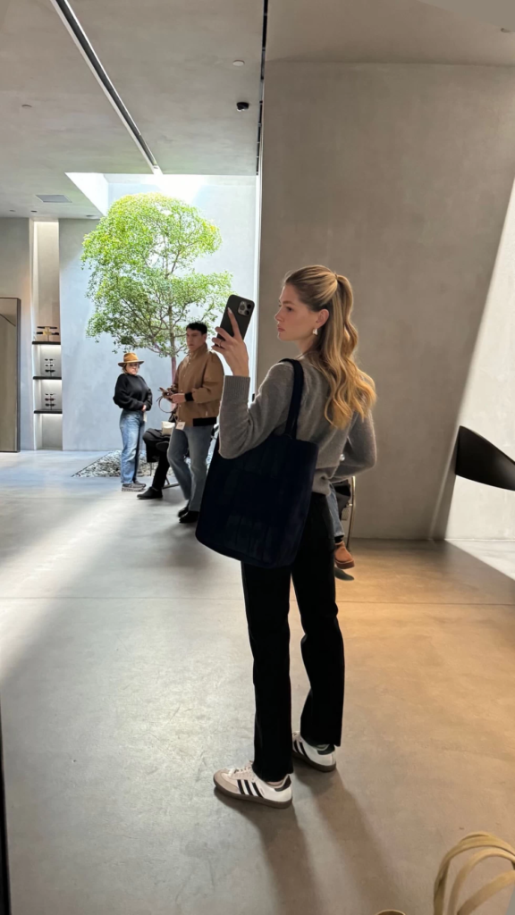 Mάλιστα για την casual εμφάνισή της η Αμαλία Κωστοπούλου επέλεξε τζιν μαύρο παντελόνι, μαύρη tote bag και τα sneakers Samba της Adidas που κάνουν φέτος θραύση. Είναι τα αγαπημένα παπούτσια των it girls. Τα συγκεκριμένα sneakers κοστίζουν 120 ευρώ.