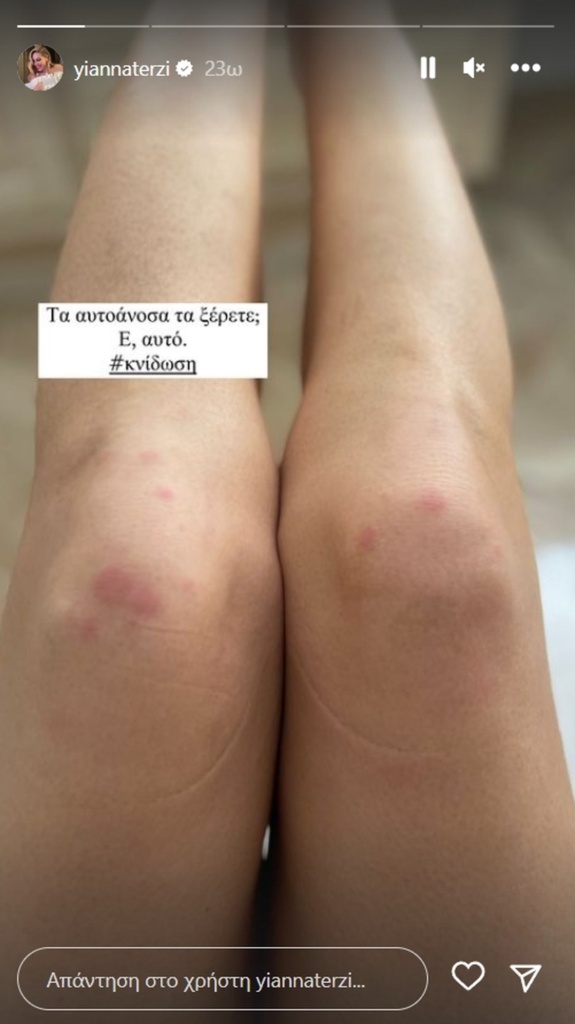Πριν λίγες ώρες, η γνωστή τραγουδίστρια θέλησε να γνωστοποιήσει στους διαδικτυακούς της φίλους πως πάσχει από κνίδωση. Η Γιάννα Τερζή δημοσίευσε μια φωτογραφία στα Instagram Stories της, όπου έδειξε τα σημάδια στα πόδια της.