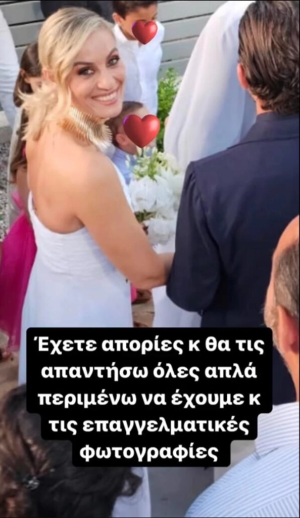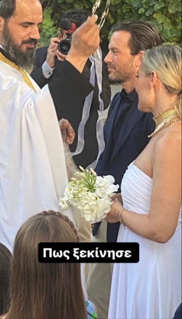 Η πρώτη φωτογραφία είναι από το μυστήριο του γάμου που όπως φαίνεται προηγήθηκε της βάφτισης. Η παρουσιάστρια φόρεσε ένα μάξι λευκό φόρεμα και ένα εντυπωσιακό χρυσό τσόκερ στον λαιμό.