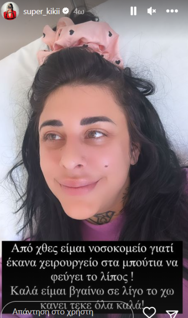 «Από χθες είμαι νοσοκομείο γιατί έκανα χειρουργείο στα μπούτια να φύγει το λίπος. Καλά είμαι, βγαίνω σε λίγο, το χω κάνει τεκέ, όλα καλά» είχε γράψει στην ανάρτησή της.