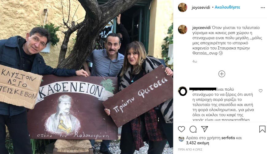«Όταν γίνεται το τελευταίο γύρισμα και κάνεις ραπ χώρου η στεναχώρια είναι πολύ μεγάλη, μόλις μας αποχαιρέτησε το ιστορικό καφενείο του Σταύρακα πρώην Φατσέα, σνιφ».