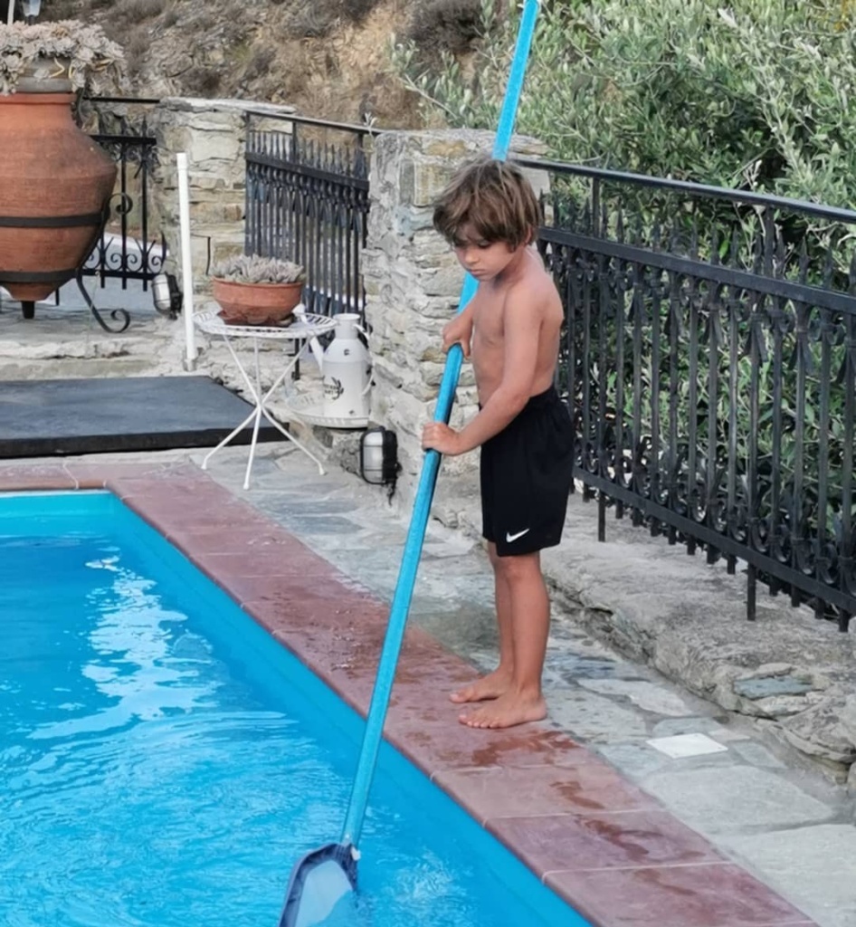 Το πέτρινο πηγάδι, τα λουλούδια και τα φυτά δεσπόζουν στην αυλή και δημιουργούν ένα παραμυθένιο σκηνικό. Οι κούνιες δεν θα μπορούσαν να λείπουν αφού η Μαλένα και ο Μανώλης Χανταμπάκης λατρεύουν να παίζουν στη φύση μαζί με τους γονείς τους.