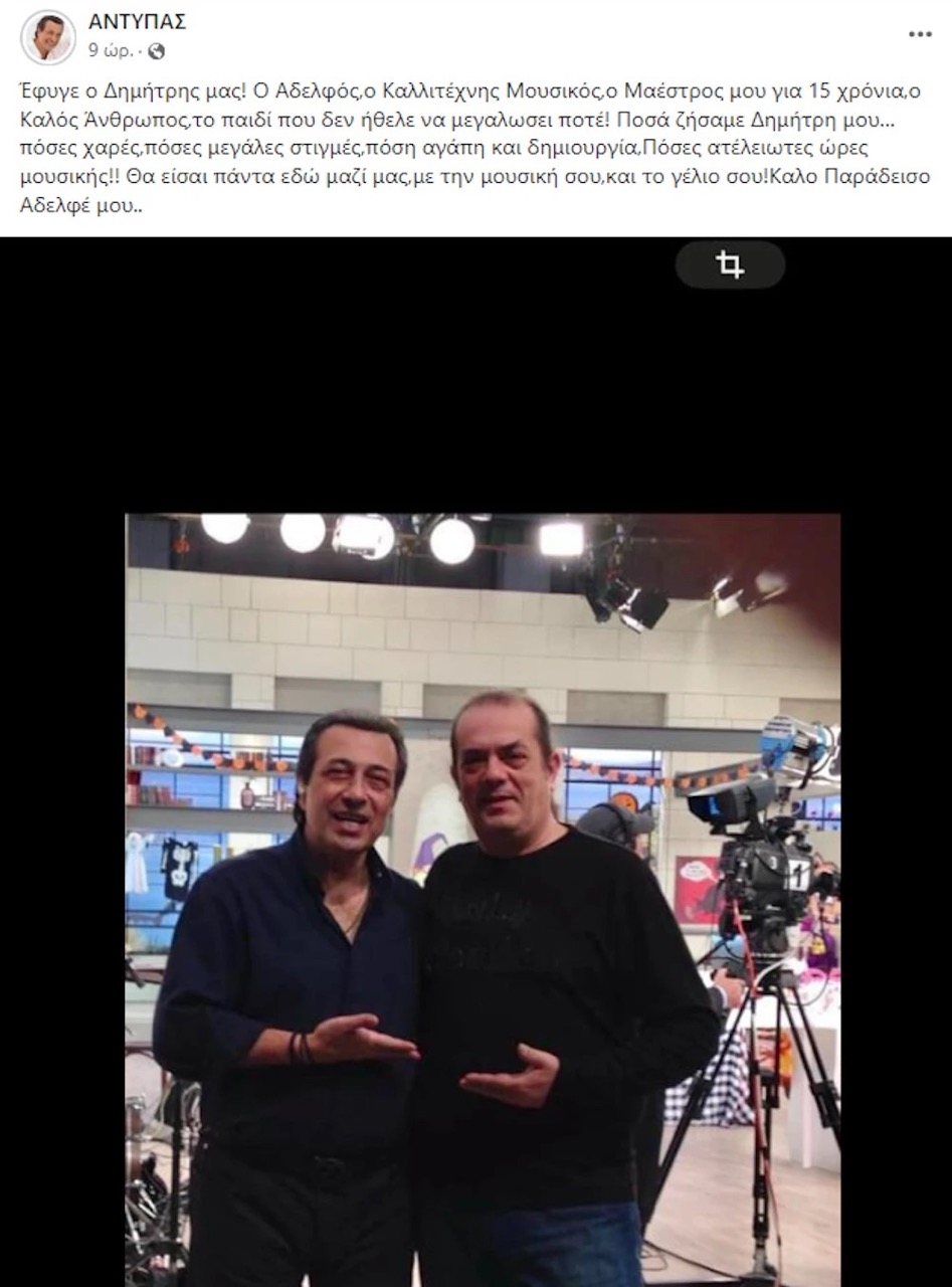 «Έφυγε ο Δημήτρης μας!» έγραψε ο Αντύπας, εκφράζοντας τη βαθιά του θλίψη για τον χαμό του Δημήτρη, ενός ατόμου που υπήρξε πολύ κοντά του, τόσο σε προσωπικό όσο και σε επαγγελματικό επίπεδο. Στην ανάρτησή του, ο τραγουδιστής αναφέρθηκε στον Δημήτρη ως «Αδελφό, Καλλιτέχνη Μουσικό, Μαέστρο του για 15 χρόνια, και Καλό Άνθρωπο»!