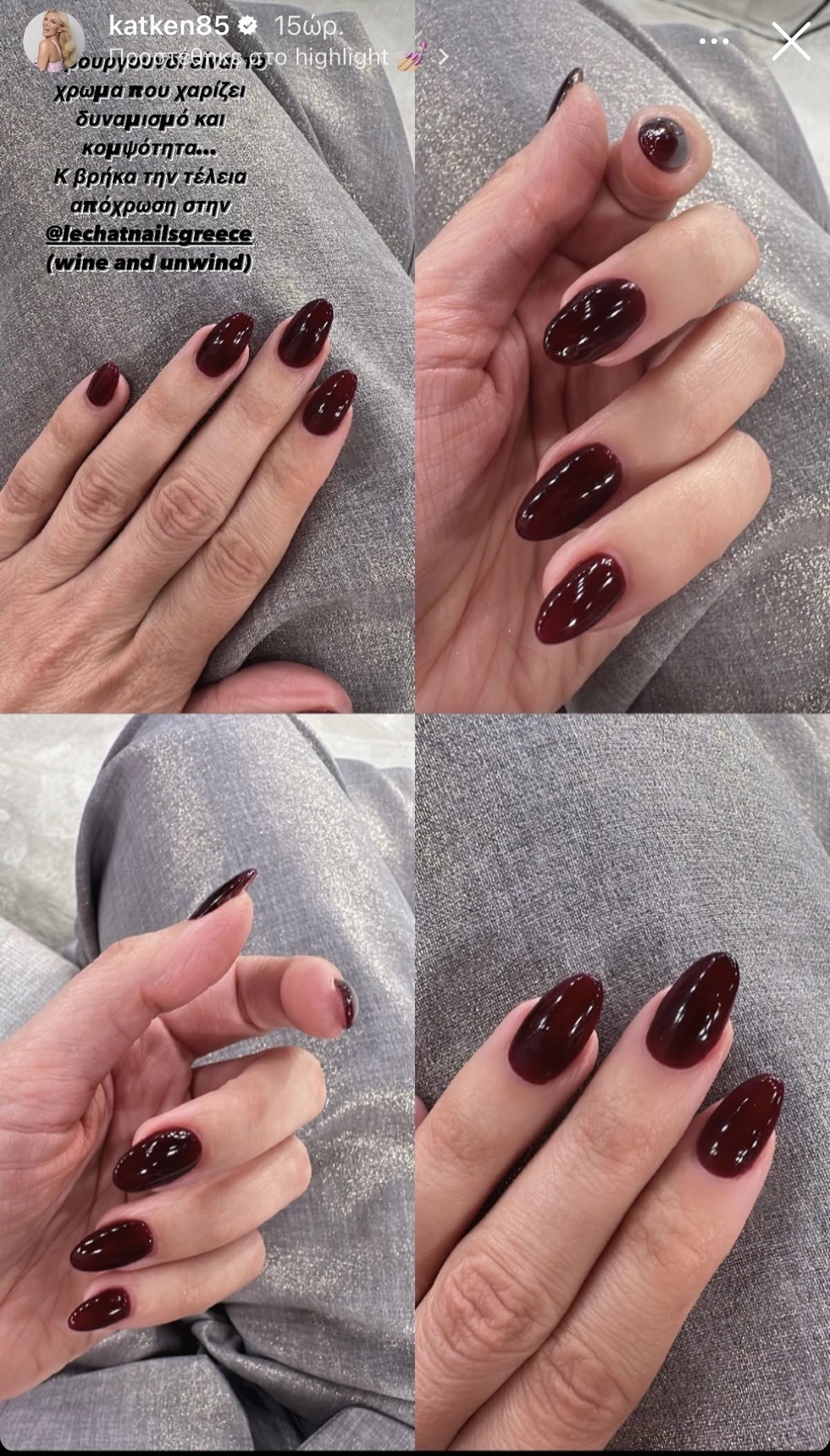 Η Κατερίνα Καινούργιου επέλεξε τα Merlot Nails που ως τάση πρωταγωνιστεί και ταιριάζει σε όλους τους χρωματικούς υποτόνους. Την χαρακτήρισε την απόχρωση της μάλιστα σαν τέλεια και το χρώμα που επέλεξε το θεωρεί ως επιλογή που χαρίζει δυναμισμό και κομψότητα.