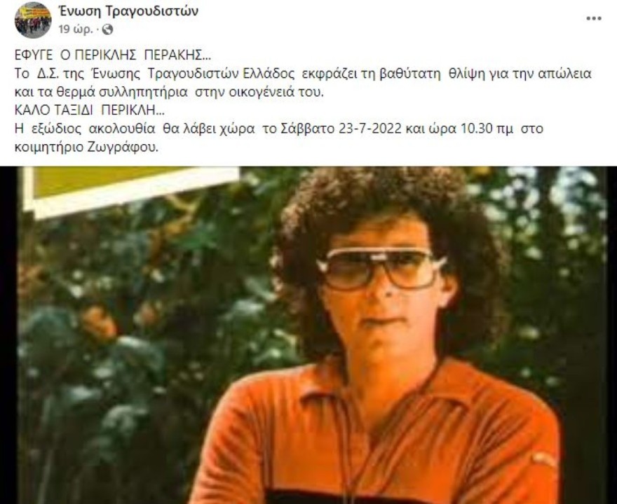 Και το Δ.Σ. της Ένωσης Τραγουδιστών Ελλάδος σε ανάρτησή του σημείωσε: «Έφυγε ο Περικλής Περάκης… Το Δ.Σ. της Ένωσης Τραγουδιστών Ελλάδος εκφράζει τη βαθύτατη θλίψη για την απώλεια και τα θερμά συλλυπητήρια στην οικογένειά του. Καλό ταξίδι Περικλή… Η εξόδιος ακολουθία θα λάβει χώρα το Σάββατο 23-7-2022 και ώρα 10.30 πμ στο κοιμητήριο Ζωγράφου».