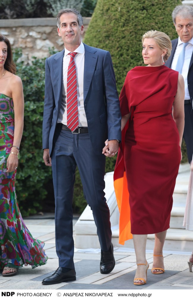 Μια από τις πιο εντυπωσιακές παρουσίες ήταν αυτή της Σίας Κοσιώνη, η οποία επέλεξε ένα φόρεμα σε έντονη απόχρωση. Συγκεκριμένα φόρεσε ένα κόκκινο μίντι φόρεμα με cape sleeve, δηλαδή ένα μανίκι που έπεφτε ως κάπα. To τελείωμα του μανικιού είχε κίτρινο χρώμα