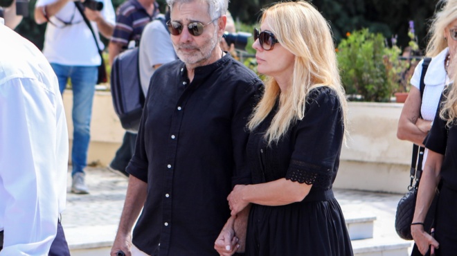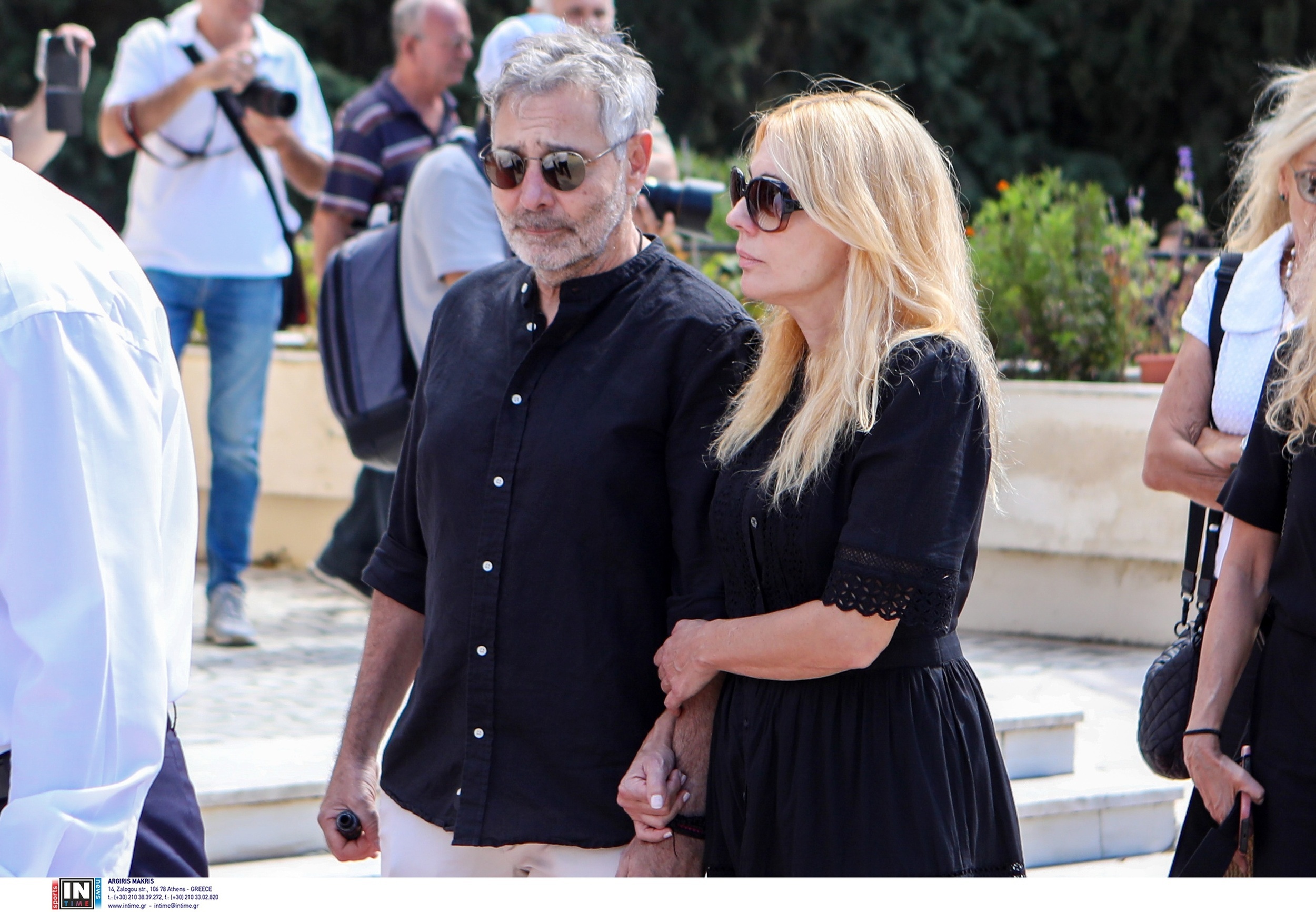 Η Κάτια Δανδουλάκη και ο Θοδωρής Αθερίδης είναι κάποιοι από τους πολλούς που έστειλαν στεφάνι με λευκά τριαντάφυλλα προς τιμήν του, όμως αυτό της κόρης του, Σμαράγδας, σπαράζει καρδιές, καθώς γράφει πάνω του: «Στον μπαμπάκα μου. Η κόρη σου, Μπούμπα».