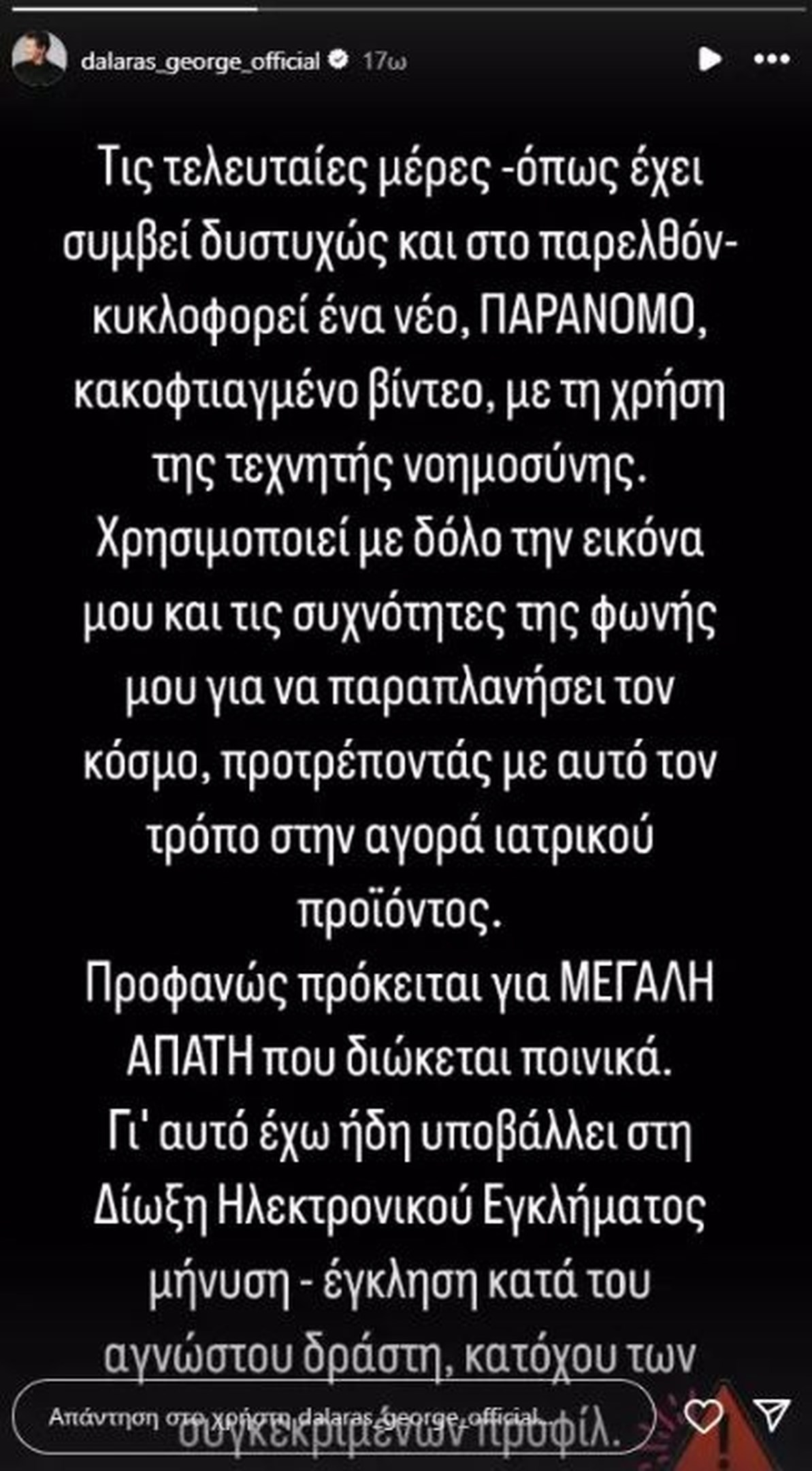 Συγκεκριμένα ο ίδιος έγραψε: «Τις τελευταίες ημέρες – όπως έχει συμβεί δυστυχώς και στο παρελθόν- κυκλοφορεί ένα νέο, παράνομο, κακοφτιαγμένο βίντεο με τη χρήση της τεχνητής νοημοσύνης. Χρησιμοποιεί με δόλο την εικόνα μου και τις συχνότητες της φωνής μου για να παραπλανήσει τον κόσμο προτρέποντας με αυτόν τον τρόπο στην αγορά ιατρικού προϊόντος. Προφανώς πρόκειται για μεγάλη απάτη που διώκεται ποινικά. Για αυτό έχω υποβάλλει στη Δίωξη Ηλεκτρονικού Εγκλήματος μήνυση – έγκληση κατά του άγνωστου δράστη, κατόχου των συγκεκριμένων προφίλ».