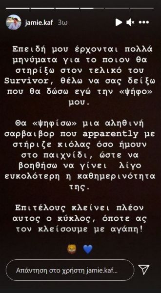 «Επειδή μου έρχονται πολλά μηνύματα για το ποιον θα στηρίξω στον τελικό του Survivor, θέλω να σας δείξω που θα δώσω εγώ την “ψήφο” μου. Θα “ψηφίσω” μια αληθινή σαρβάιβορ που apparently με στήριξε κιόλας όσο ήμουν στο παιχνίδι, ώστε να βοηθήσω να γίνει λίγο ευκολότερη η καθημερινότητά τη. Επιτέλους κλείνει πλέον αυτός ο κύκλος, όποτε ας τον κλείσουμε με αγάπη», έγραψε στην αρχή.