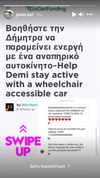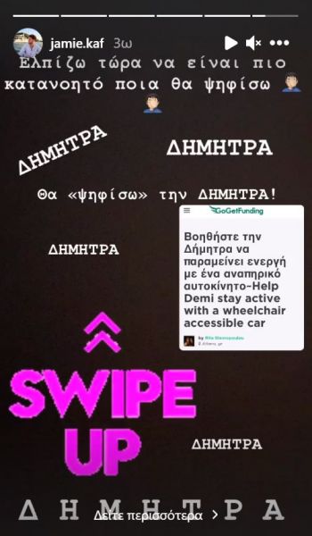 Ωστόσο, επειδή δεν έγραψε κάποιο όνομα πολλοί πίστευαν ότι εννοεί την Μαριαλένα Ρουμελιώτη. Με νέα του ανάρτηση όμως ξεκαθάρισε και δήλωσε πως θα στηρίξει την Δήμητρα, η οποία χρειάζεται βοήθεια για να παραμείνει ενεργή με ένα αναπηρικό αυτοκίνητο.