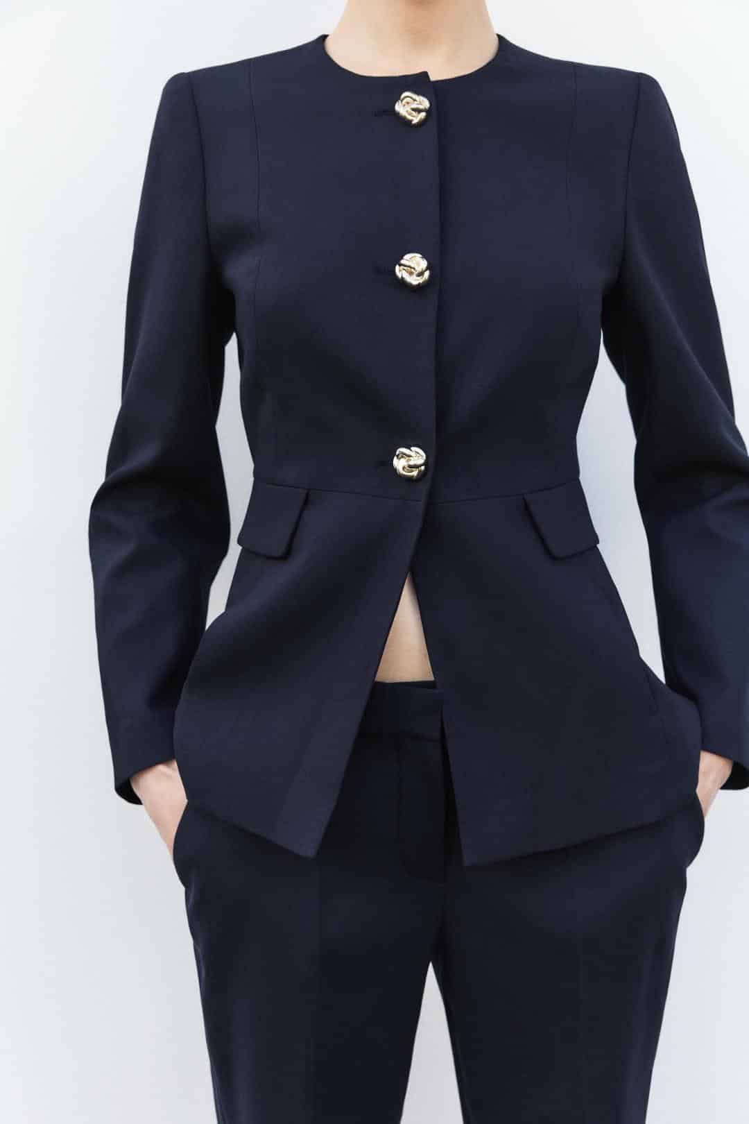 Στις νέες αφίξεις των Zara ανακαλύψαμε ένα blazer στο στιλ της πριγκίπισσας Νταϊάνα, που σίγουρα θα το φορούσε και η ίδια. Πρόκειται για ένα σακάκι με στρογγυλό κόψιμο στο λαιμό και με έντονους ώμους σε navy blue χρώμα. Ακόμη, στην μπροστινή πλευρά διαθέτει τρία ανάγλυφα χρυσά κουμπιά.