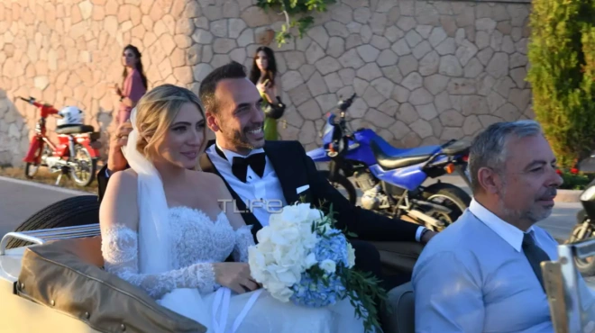 Λίγη ώρα αργότερα, στην εκκλησία έφτασε και η εντυπωσιακή νύφη μέσα σε ένα ολόλευκο αυτοκίνητο συνοδευόμενη από τον μπαμπά της και με το πρόσωπό της να λάμπει από ευτυχία. Ο πατέρας της Μαριλού Κόζαρη, την παρέδωσε στον Πάνο Μουζουράκη αφού πρώτα τον αγκάλιασε και του ψιθύρισε κάτι στο αυτί και στη συνέχεια εκείνη έπεσε στην αγκαλιά του δίνοντάς του ένα τρυφερό φιλί στο στόμα.