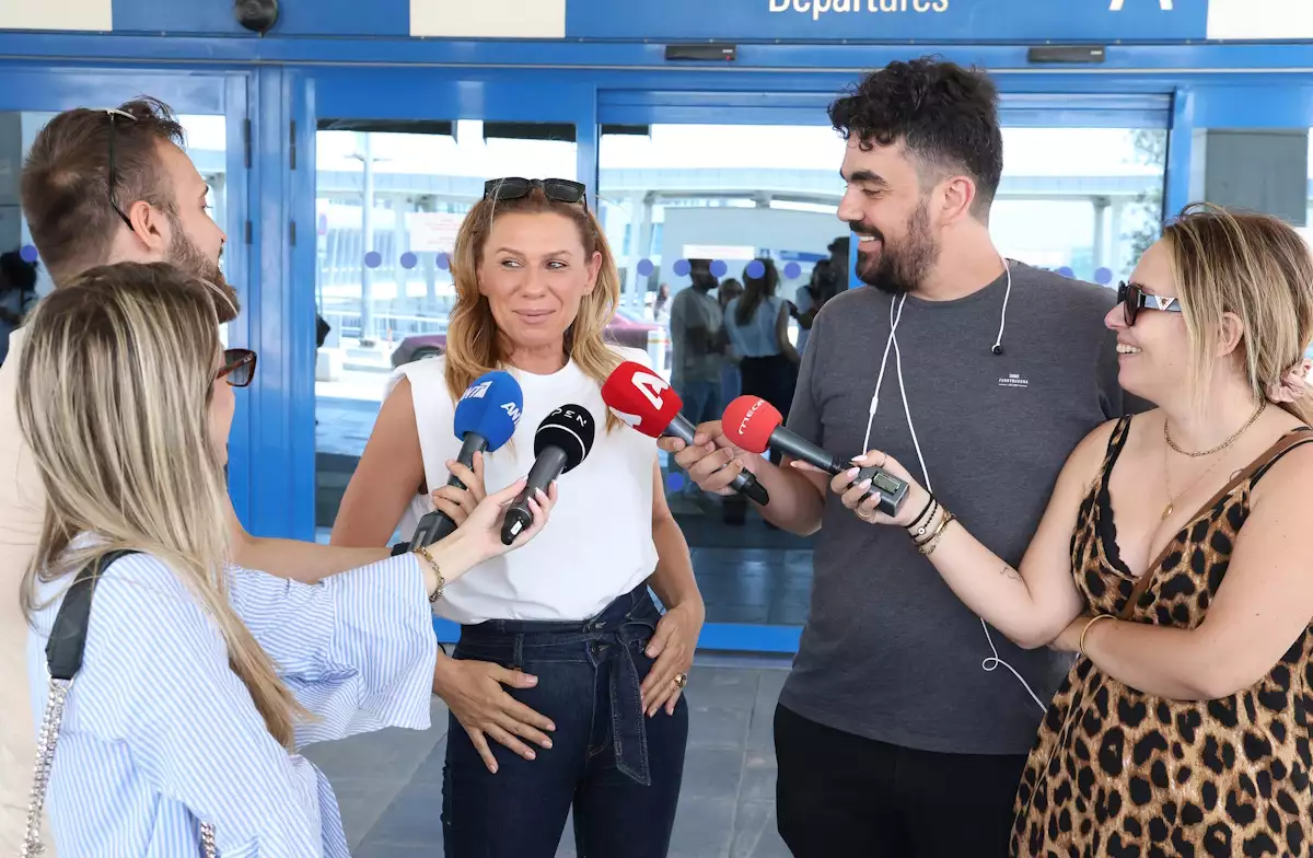 Ειδικότερα, η παρουσιάστρια χαιρέτησε τα τηλεοπτικά συνεργεία και έκανε δηλώσεις στους δημοσιογράφους, που την περίμεναν στο αεροδρόμιο «Ελευθέριος Βενιζέλος».