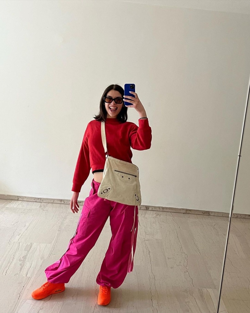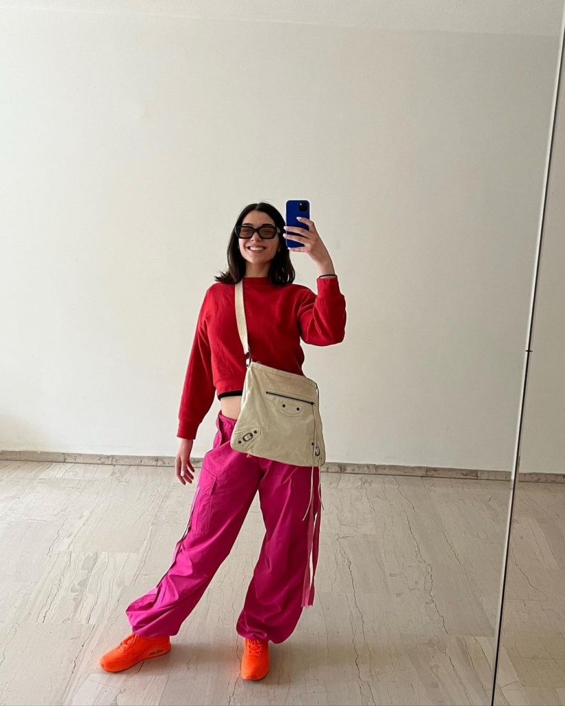 Η 19χρονη λοιπόν Μελίνα, υιοθέτησε το color blocking, την τάση δηλαδή που συνδυάζει πολλά και έντονα χρώματα, που έχει κάνει αισθητή την εμφάνισή της στη βιομηχανία της μόδας τα τελευταία χρόνια. Φόρεσε ένα ροζ cargo παντελόνι με ένα κόκκινο τοπ και πορτοκαλί σνίκερς και μας έφτιαξε τη διάθεση με την εικόνα της. Δεν φορούσε ίχνος μακιγιάζ και το χαμόγελό της ήταν ένα από τα δυνατά σημεία της εμφάνισής της.