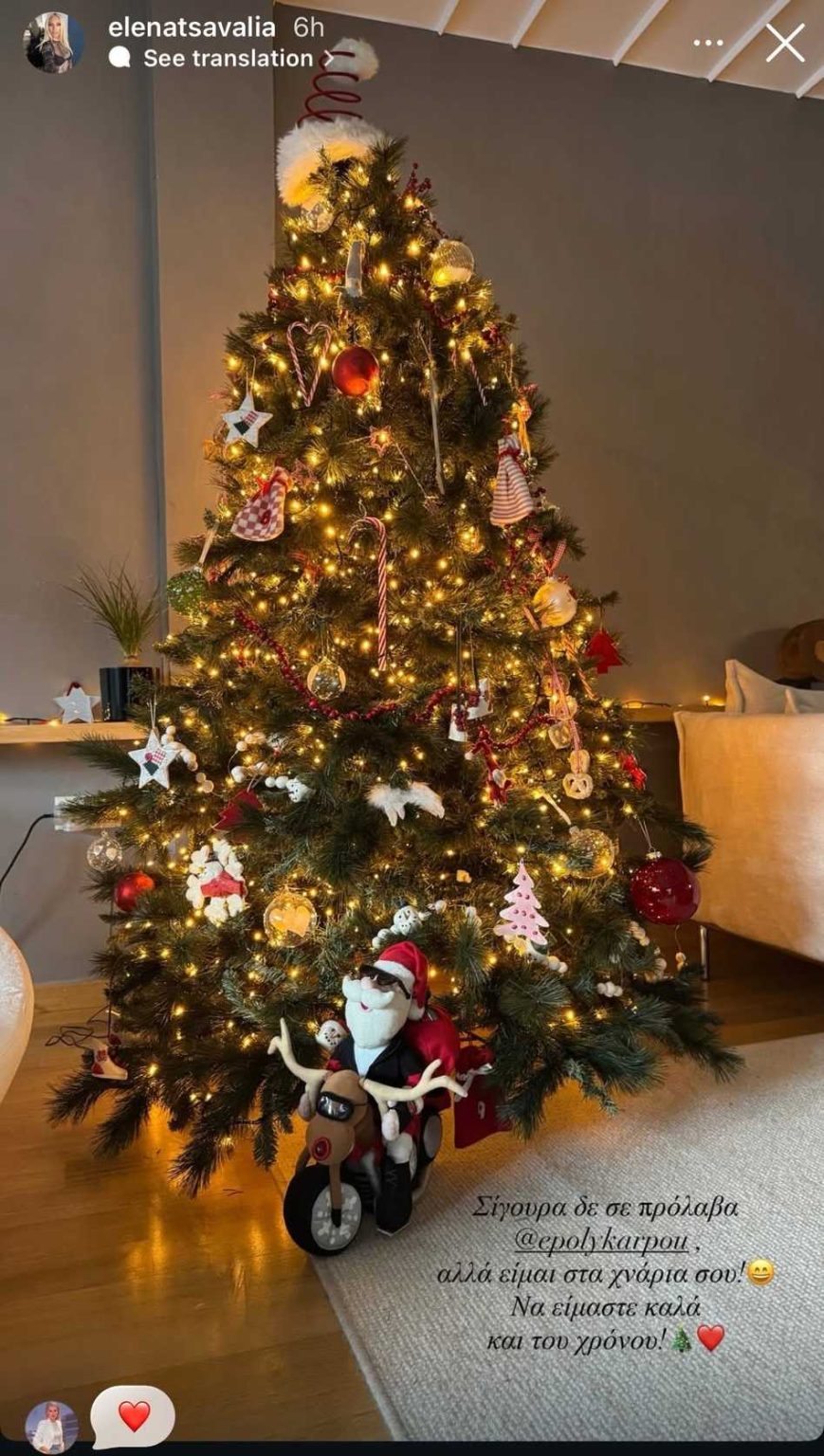 Η Έλενα Τσαβαλιά μοιράστηκε πριν λίγες ώρες μέσα από τον προσωπικό της λογαριασμό στο Instagram το Χριστουγεννιάτικο δέντρο που στόλισε για τις φετινές Γιορτές. Ένα δέντρο παραδοσιακό, μαμαδίστικο, χαριτωμένο, που μας ξύπνησε αναμνήσεις από τα Χριστούγεννα των παιδικών μας χρόνων. Με γλειφιτζούρια, λούτρινα κι άλλα διακοσμητικά μα πάνω από όλα, με έναν αυθορμητισμό που στο τέλος έρχεται και δίνει το πιο υπέροχο αποτέλεσμα.