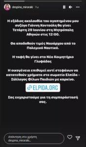 Η Δέσποινα Μοιραράκη μέσα από τον λογαριασμό της στο instagram έκανε παράκληση, αντί για στεφάνια στην κηδεία του Γιάννη Κοντούλη, να δοθούν τα χρήματα σε παιδιά που πάσχουν από καρκίνο.
