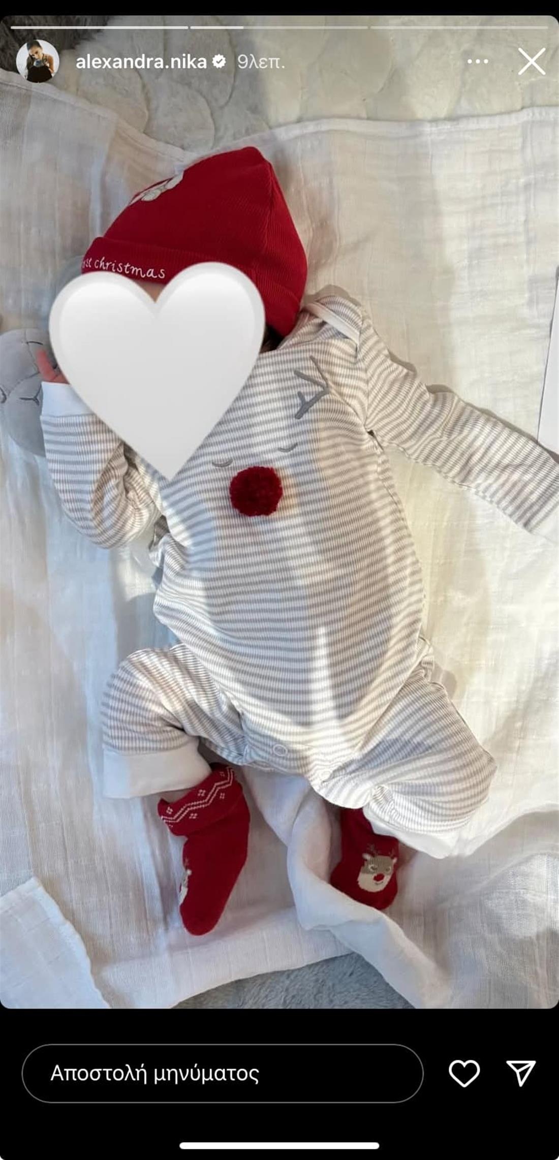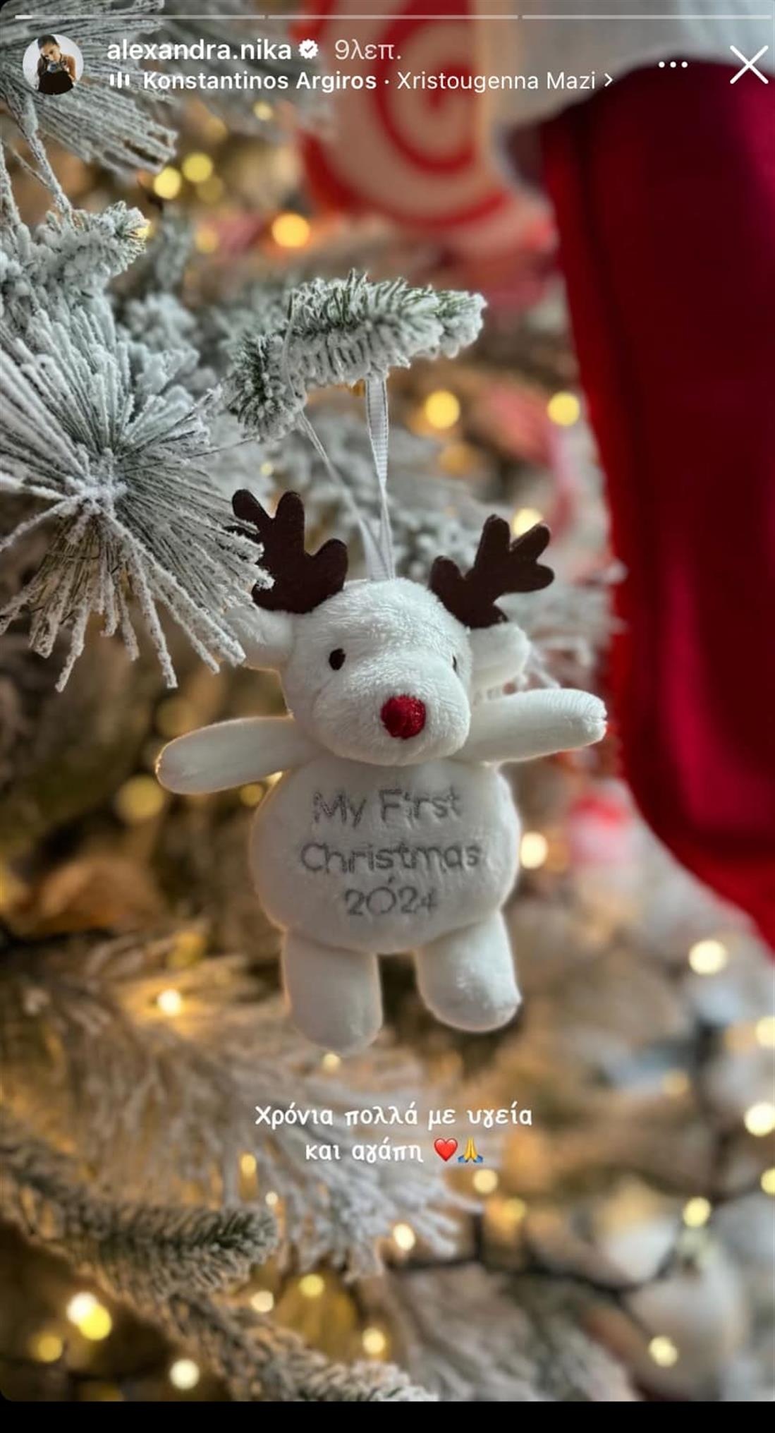 Την παραμονή των Χριστουγέννων, η Αλεξάνδρα μοιράστηκε τη χαρά της μέσα από τον λογαριασμό της στο Instagram, δημοσιεύοντας δύο τρυφερές φωτογραφίες. Στην πρώτη, φαίνεται ένα στολίδι που γράφει «Τα πρώτα Χριστούγεννα του μωρού», αποτυπώνοντας τη μαγική στιγμή της νέας τους οικογένειας.