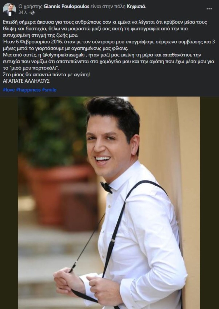 Ήταν 6 Φεβρουαρίου 2016, όταν με τον σύντροφο μου υπογράψαμε σύμφωνο συμβίωσης και 3 μήνες μετά το γιορτάσουμε με αγαπημένους μας φίλους. Μια από αυτές, η @olympiakrasagaki, ήταν μαζί μας εκείνη τη μέρα και απαθανάτισε την ευτυχία που νομίζω ότι αποτυπώνεται στο χαμόγελο μου και την αγάπη που έχω μέσα μου για το “μισό μου πορτοκάλι”. Στο μίσος θα απαντώ πάντα με αγάπη! ΑΓΑΠΑΤΕ ΑΛΛΗΛΟΥΣ».