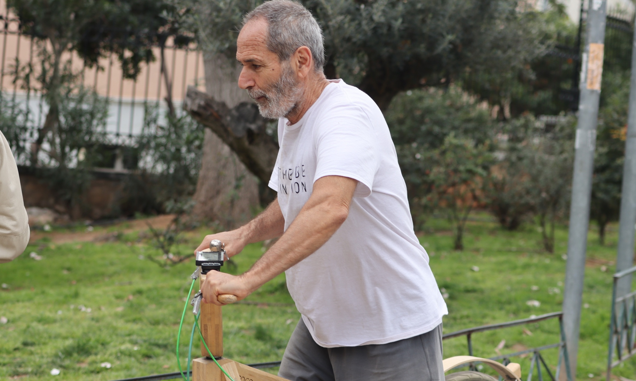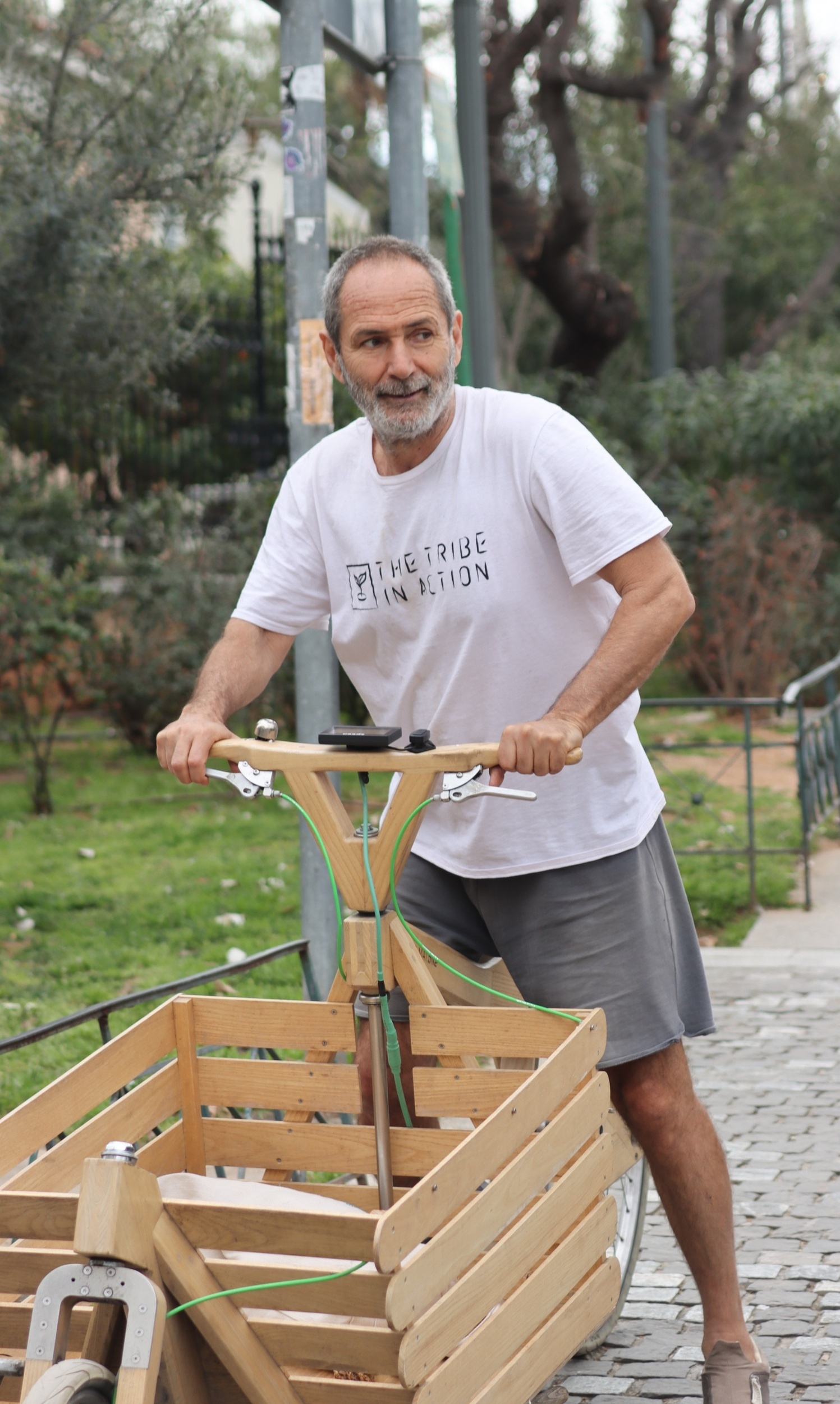 Ο γνωστός επιχειρηματίας με το ηλεκτρικό ξύλινο ποδήλατό του, έκανε τη βόλτα του επί του πεζοδρόμου της Διονυσίου Αρεοπαγίτου, με τον γιο του να τον ακολουθεί με το δικό του ποδήλατο, που έχει γίνει must μεταφορικό μέσο για όλα τα μέλη της οικογένειας.