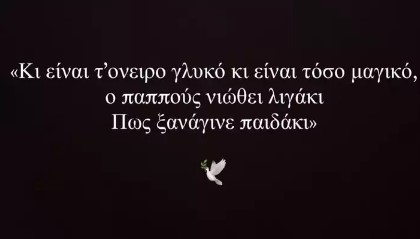 Και στη συνέχεια, κοινοποίησε ακόμα ένα μήνυμα σε μαύρο φόντο. «Κι είναι τ’ όνειρο γλυκό, και είναι τόσο μαγικό, ο παππούς νιώθει λιγάκι πως ξανάγινε παιδάκι» έγραψε η youtuber.