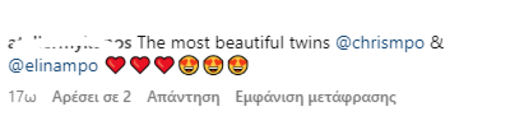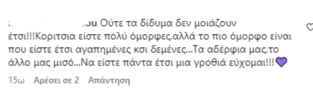 Οι περισσότεροι από όσους σχολίασαν την ανάρτησή της, επισήμαναν πόσο μοιάζουν οι δύο αδερφές. «Σαν δίδυμες είστε», τους γράφουν, μεταξύ άλλων.