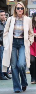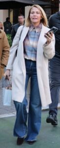 Όσο για την Τζένη, έκανε μια πολύ στιλάτη εμφάνιση με ψηλόμεσο τζιν καμπάνα, καρό πουκάμισο και κρεμ μακρύ σακάκι.
