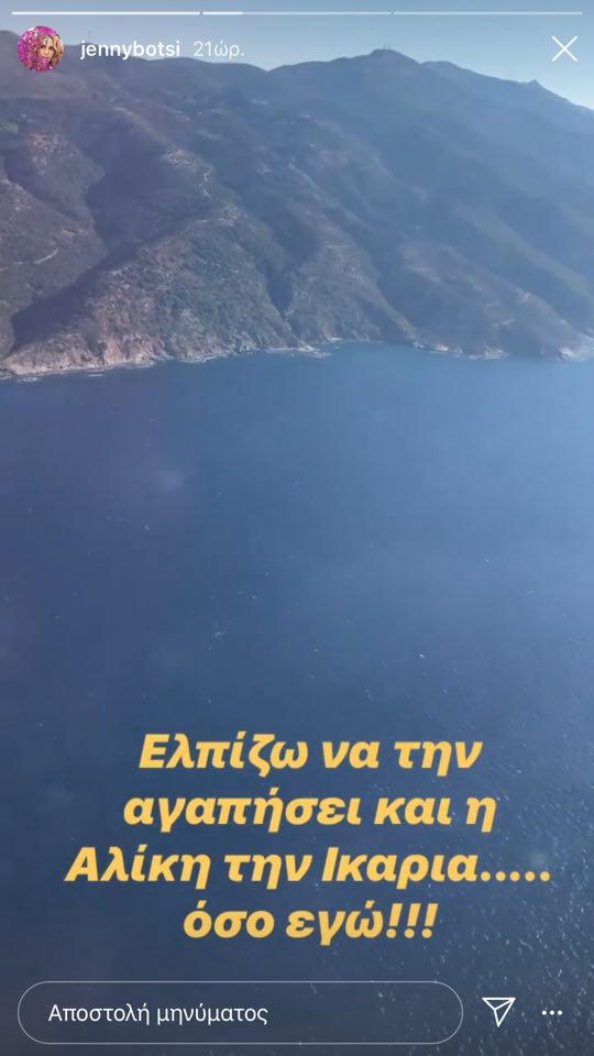 «Ελπίζω να την αγαπήσει και η Αλίκη την Ικαρία…όσο εγώ!!!», έγραψε σε story της.Ενώ μοιράστηκε και μια φωτογραφία με την 10 μηνών κόρη της λίγο πριν ταξιδέψουν, πάντα τηρώντας τα μέτρα ασφαλείας.