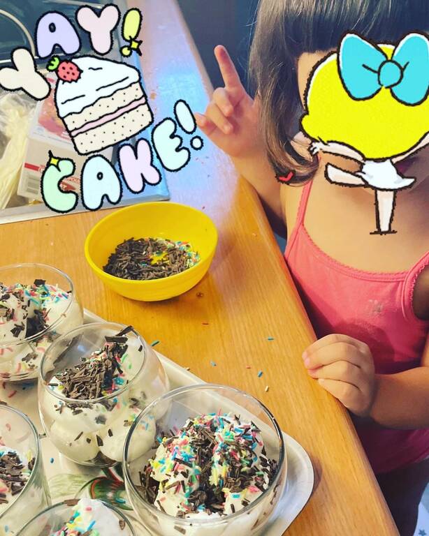 “Γλυκάκι σε ποτήρι με πολλά χρωματιστά κουφετάκια και νιφάδες σοκολάτας… αν ξεκίνησε από τα δυόμισι ??#homemadecake #δημιουργει#γλυκια μου κορούλα #playtime #playforever”, ήταν η λεζάντα που συνόδευσε τη φωτογραφία, που δείχνει την κόρη της να ποζάρει με τα αριστουργήματά της.
