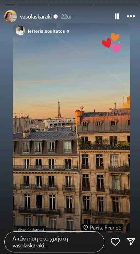 Σύμφωνα με τα stories που ανέβασαν και οι δύο, το ζευγάρι βρίσκεται αυτές τις ημέρες στο μαγευτικό Παρίσι, απολαμβάνοντας μια ρομαντική απόδραση με αφορμή τα γενέθλια της ηθοποιού.