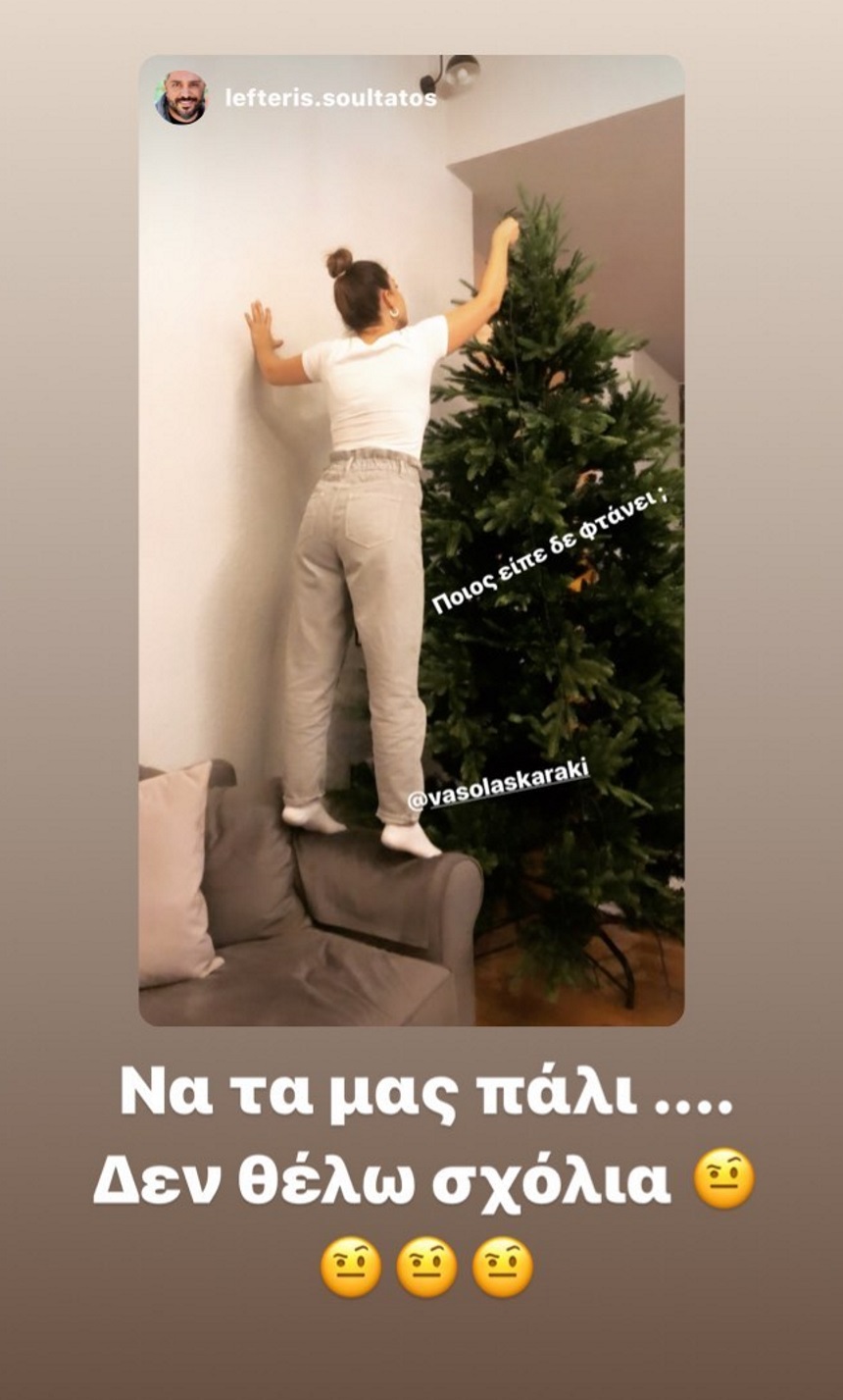 Αυτή τη φορά, ο Λευτέρης Σουλτάτος, που δεν σταματά να την πειράζει, τρόλαρε την Βάσω Λασκαράκη για το ύψος της, καθώς η ηθοποιός ανέβηκε στον καναπέ για να φτάσει το επάνω μέρος του χριστουγεννιάτικου δέντρου του σαλονιού.