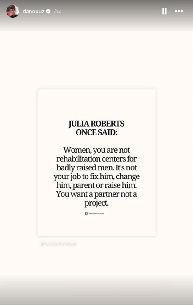 «H Julia Roberts είπε κάποτε: Γυναίκες, δεν είστε κέντρα αποκατάστασης για άνδρες που δεν είχαν καλή ανατροφή. Δεν είναι δουλειά σας να τους “φτιάξετε”, να τους αλλάξετε, να γίνεται γονείς τους ή να τους αναθρέψετε. Θέλετε έναν σύντροφο, όχι ένα project» έγραφε πάνω στη φωτογραφία.